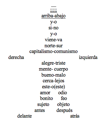 Sobre aquel sustrato epistemo-biológico que el devenir evolutivo de las especies hubo de construir para el hombre, sólo nos fue dado representar el mundo de una manera dicotómica: imposible nos fue conocer el arriba sin el abajo, ubicar el derecho sin el izquierdo, imaginar un cielo sin un infierno, concebir una alegría sin una tristeza, tener la noción de paz sin la de guerra.