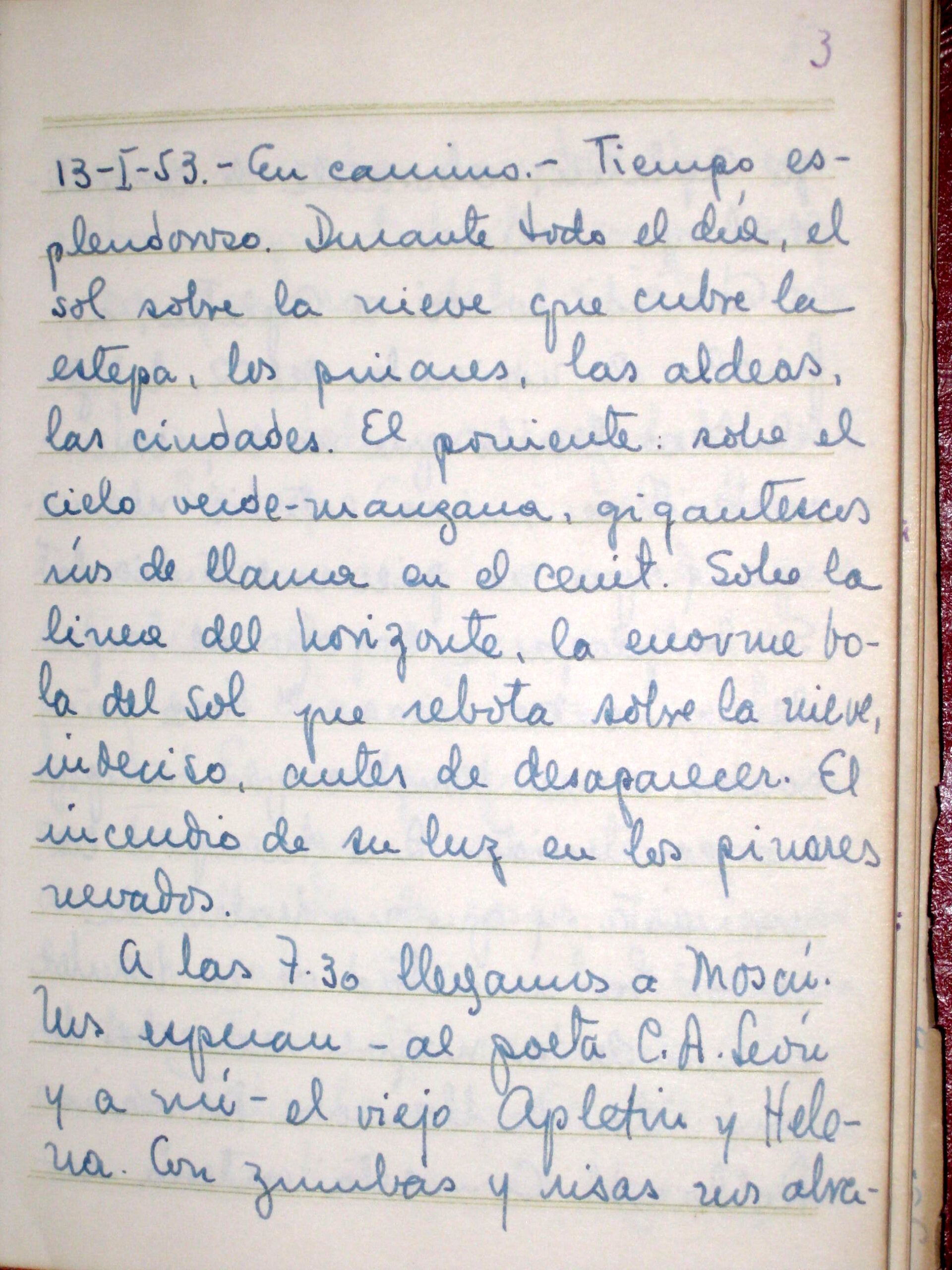 13-I-53. –En camino– Tiempo esplendoroso. Durante todo el día el sol sobre la nieve que cubre la estepa, los pinares, las aldeas, las ciudades. El poniente sobre el cielo verde-manzana, gigantescos ríos de llanura en el cenit. Sobre la línea del horizonte, la enorme bola del sol que rebota sobre la nieve, indeciso, antes de desaparecer. El incendio de su luz en los pinares nevados.
